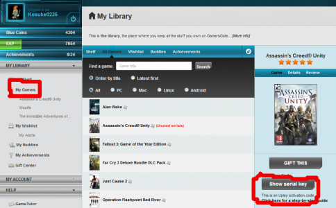 赤枠の「Show Serial Key」を押すことでそのゲームのキーコードを表示させることが出来ます。