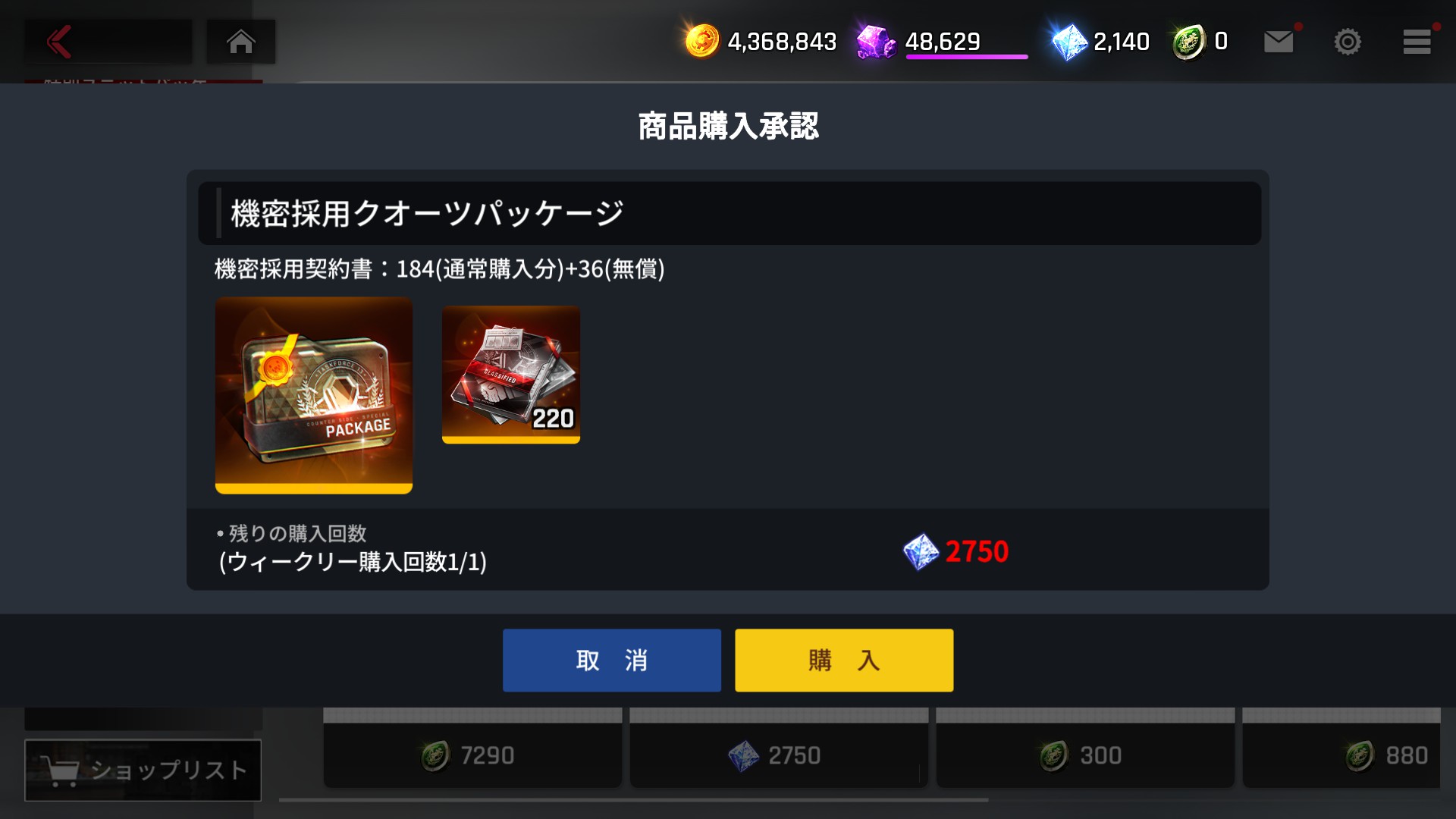 ガチャを回す際は、必ず毎週更新される常設パッケージの”機密採用クオーツパッケージ”と、ショップにある交換所をMAX5回分全て交換して下さい。