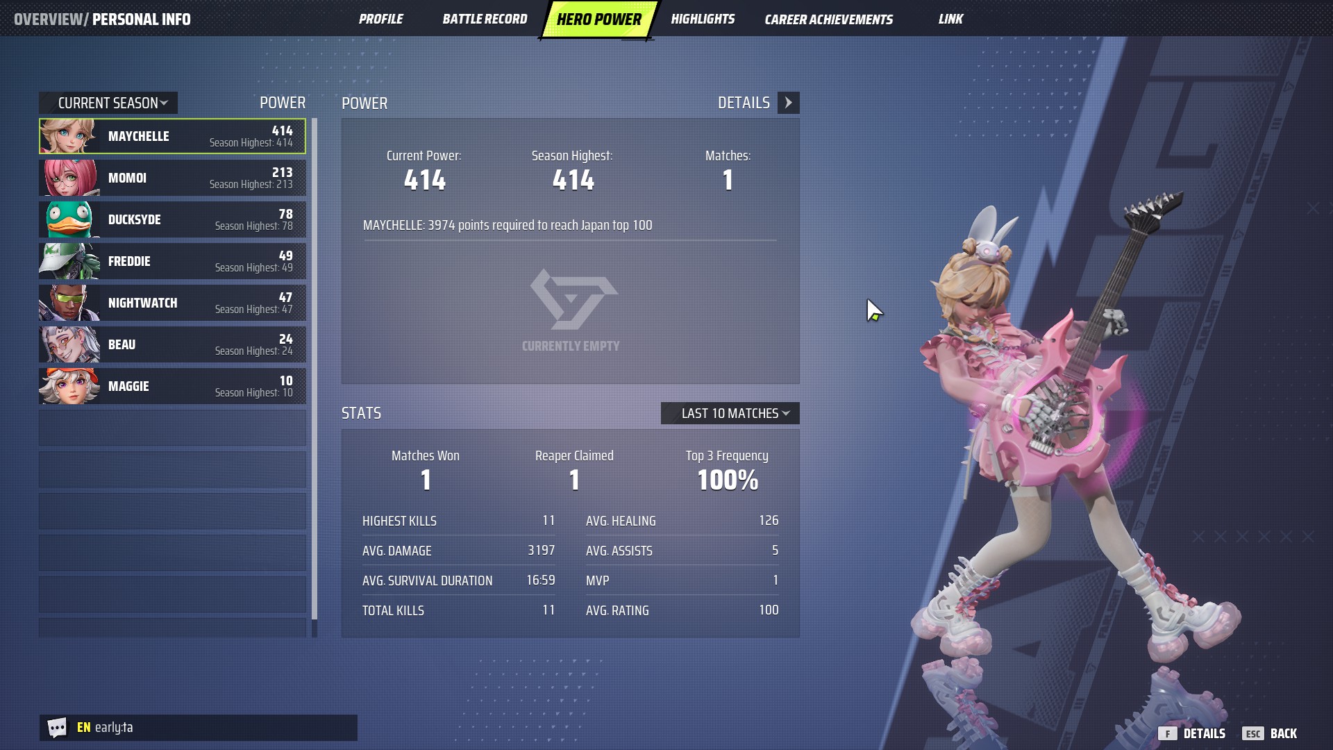 また各キャラの戦績を数値化したヒーローパワーでは、1マッチ中のキル/順位/稼いだ経験値に応じてスコアが算出されるようになっており、地域や国別のキャラランキングが表示されるなど、対人ゲーの中では珍しい要素。