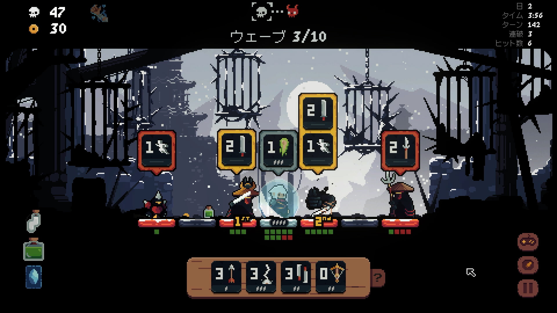 和風ドット絵が特徴的な本作は、侍となって戦うデッキ構築型ローグライク・ストラテジー。7マスという限られたエリアを前後に移動しながら、攻撃カードを駆使してステージ攻略に励んでいきます。プレイヤー一つ一つの行動が重要視され、カードを組み合わせたコンボや死に戻りによるスキル取得など、シンプルながら奥深い作品に仕上がっています。